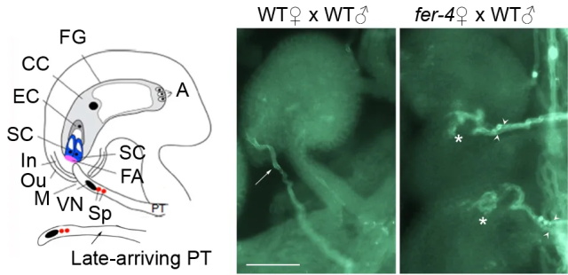论文第一作者、山东农业大学园艺科学与工程学院段巧红教授向记者介绍,一般情况下,一个胚珠只允许一个花粉管进入,以防止遗传紊乱。团队研究发现,多个花粉管进入同一个胚珠这一不正常现象,在拟南芥FERONIA受体激酶的缺失突变体(fer)中很常见。进一步研究表明,FERONIA受体激酶调控了低甲酯化果胶质在丝状器的积累,进而调控了第一个花粉管诱导的一氧化氮在丝状器的积累。一氧化氮对诱导花粉管进入胚珠的诱饵蛋白进行亚硝基化修饰,一方面阻止其分泌,另一方面使其失去诱导花粉管的活性,其他花粉管因此不能进入这个“名花有主”的胚珠。而fer突变体胚珠,低甲酯化的果胶质及一氧化氮在丝状器部位的含量都显著低于野生型胚珠。