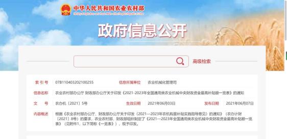 通知原文如下: 农业农村部办公厅 财政部办公厅关于印发《2021-2023年全国通用类农业机械中央财政资金最高补贴额一览表》的通知